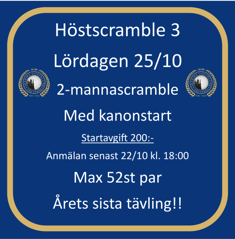 Årets sista möjlighet att spela tävling hos oss. Vi kör en tvåmannascramble lördagen den 25/10 med kanonstart på förmiddagen. Ta med din bästa golfkompis och