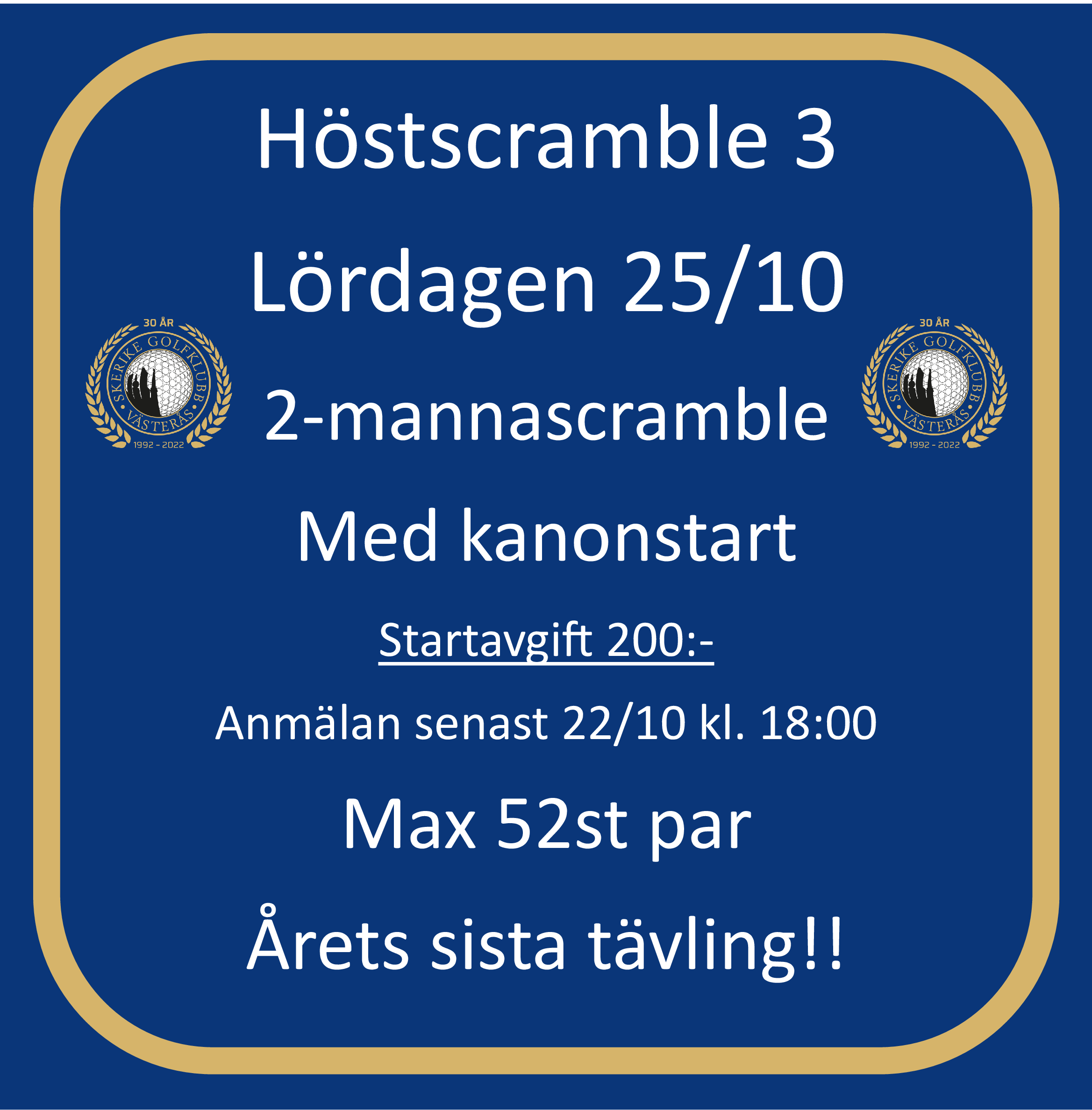 Årets sista möjlighet att spela tävling hos oss. Vi kör en tvåmannascramble lördagen den 25/10 med kanonstart på förmiddagen. Ta med din bästa golfkompis och avsluta säsongen på topp. Extratävling med närmast hål gäller som vanligt. Anmälan görs via mingolf.se.