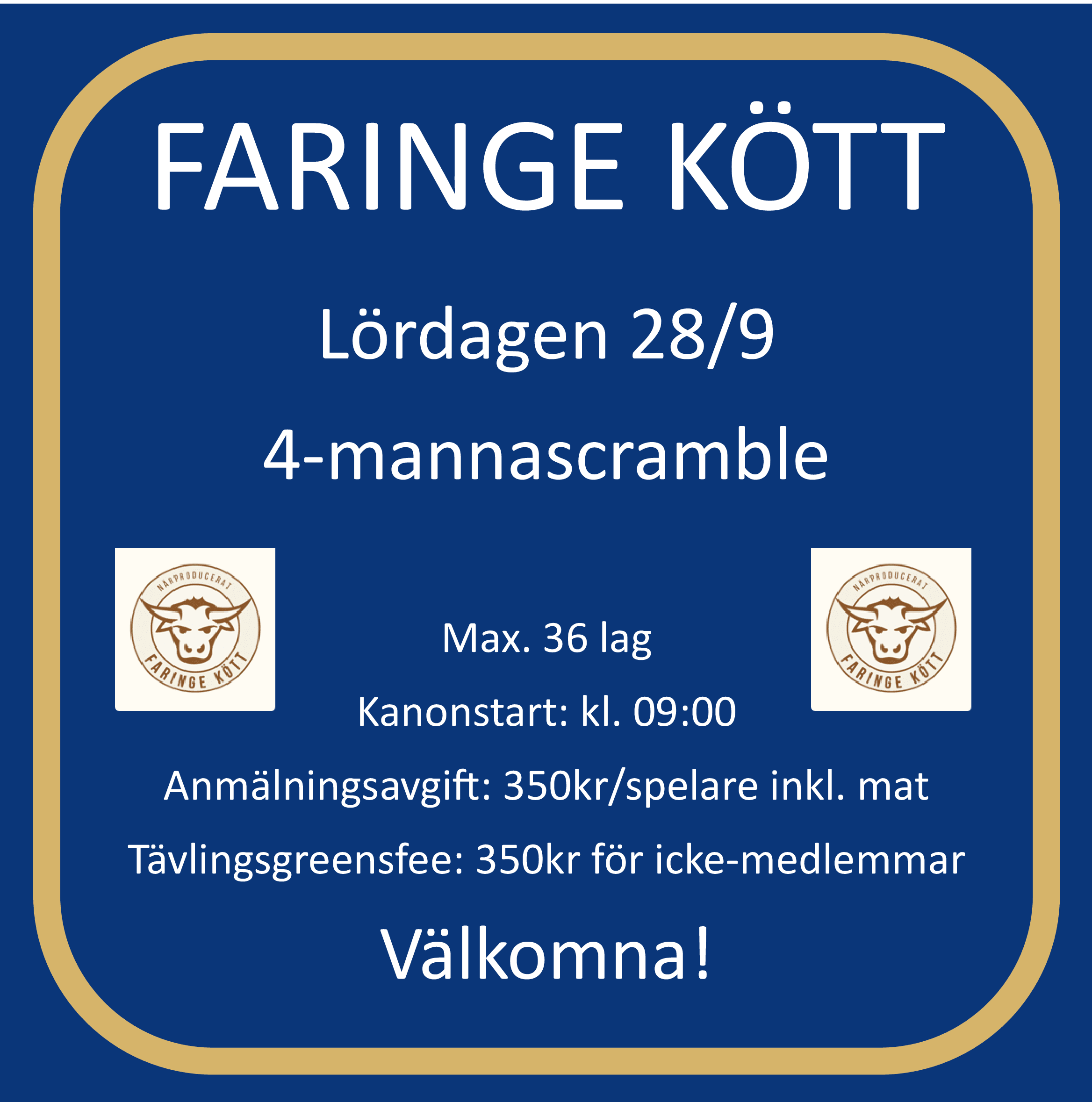 Lördagen den 28/9 är det dags för Faringe Kötts fyrmannascramble. Vi kör kanonstart vid kl. 09:00 och efter avslutad runda bjuds det på kött med tillbehör. Antalet lag är begränsat till 36st och anmälan är öppen t.o.m. 25/9 kl. 18:00, först till kvarn som gäller.